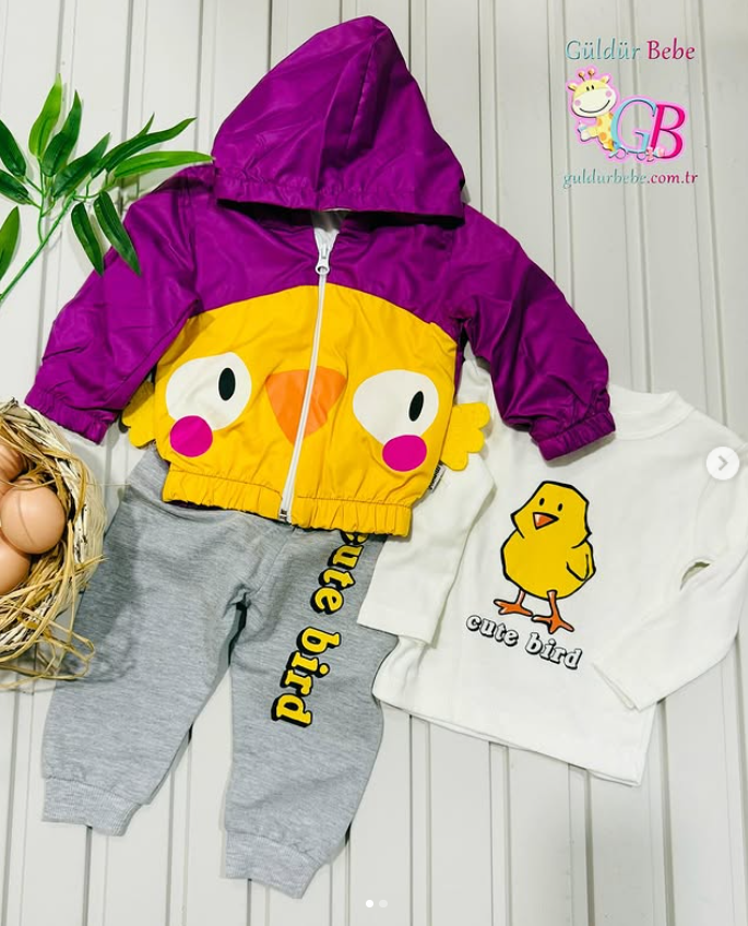 İbik aksesuarlı civciv baskılı mevsimlik 3’lü bebek takım