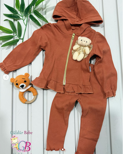 Ribana kumaş ayıcık aksesuarlı kapüşonlu ikili kız bebek takım
